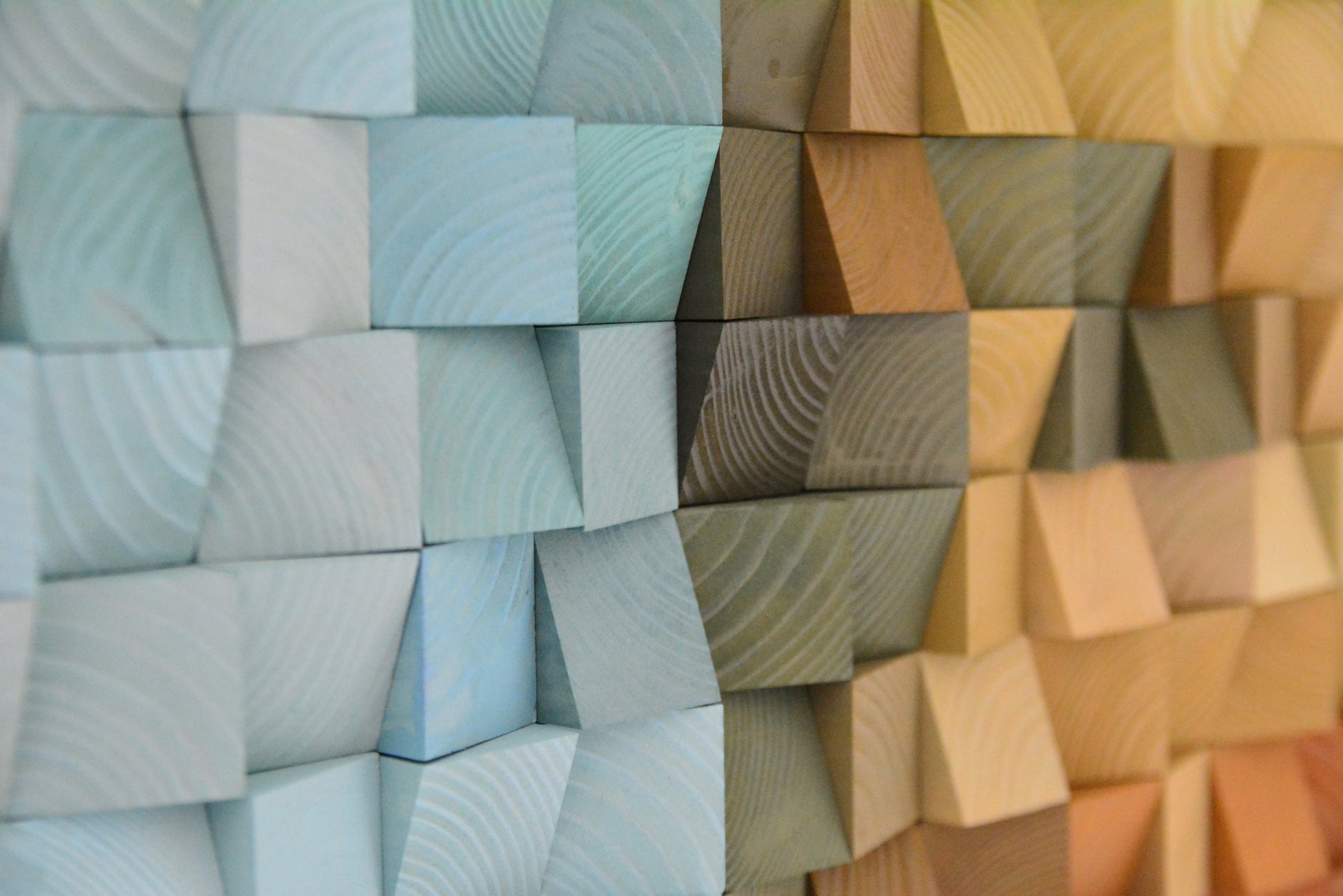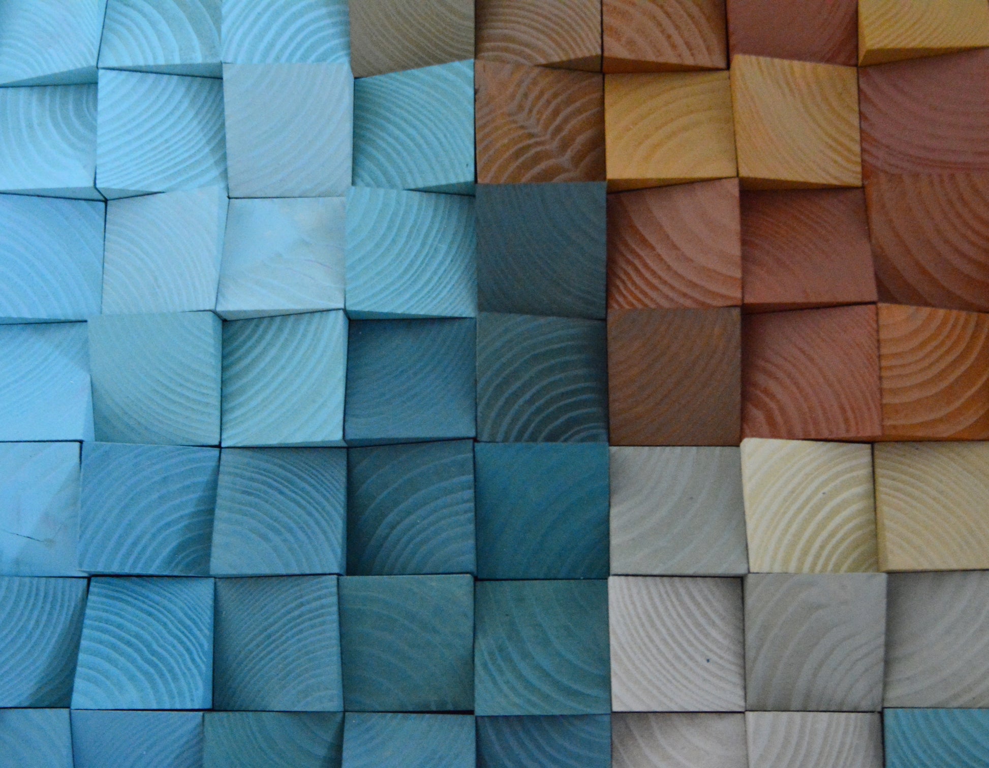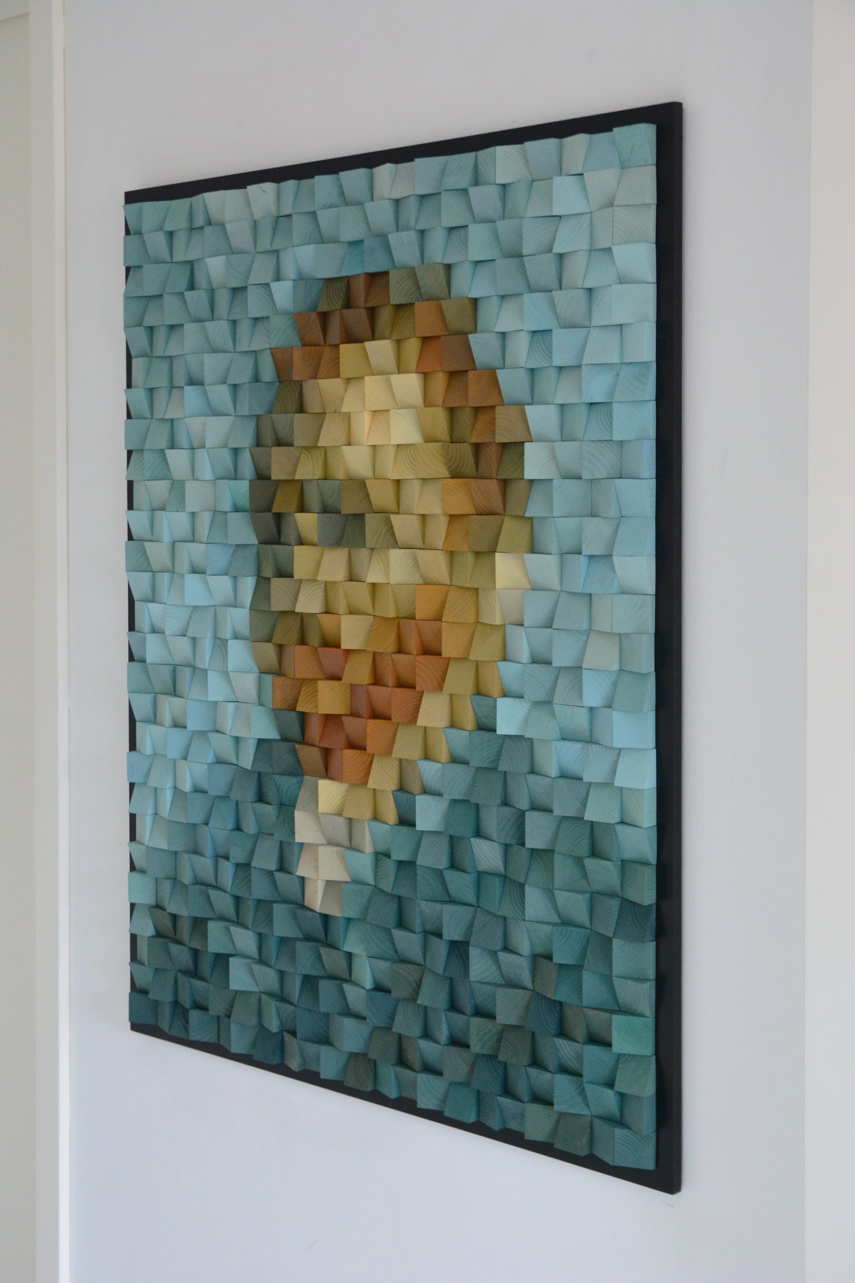 Handcrafted wooden pixel artwork.